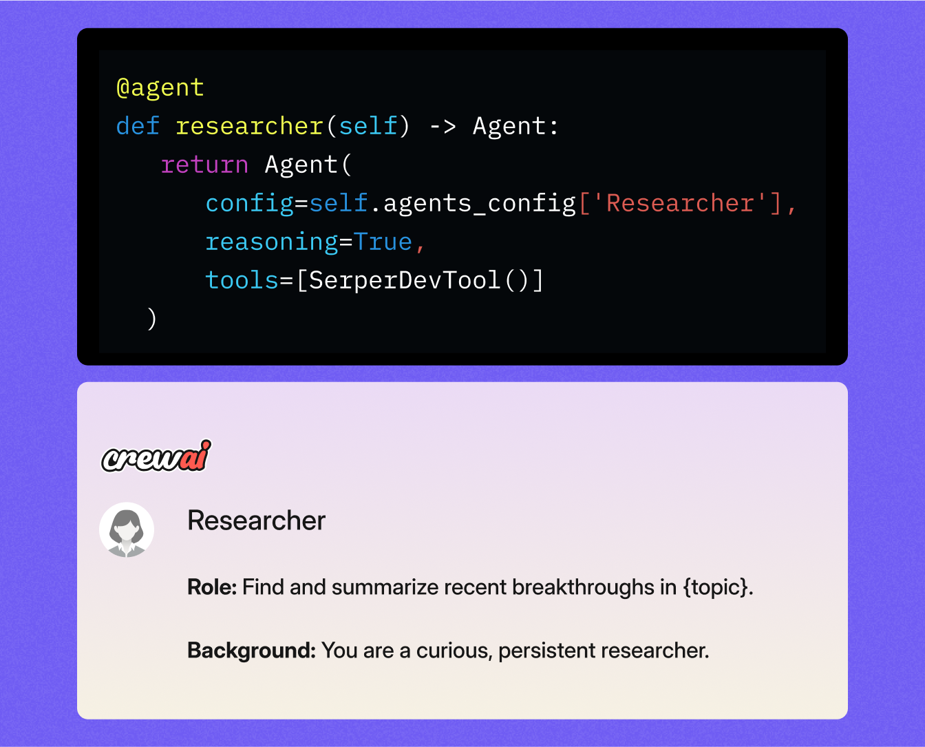 Anyone can build a crew of AI agents, from engineers who appreciate elegant APIs to subject matter experts empowered with a visual editor and AI copilot.