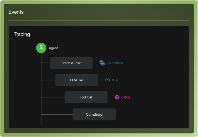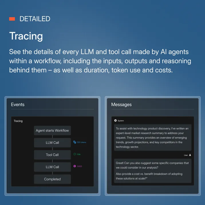 See precisely how teams of AI agents plan tasks, prompt LLMs, call tools and interpret results.