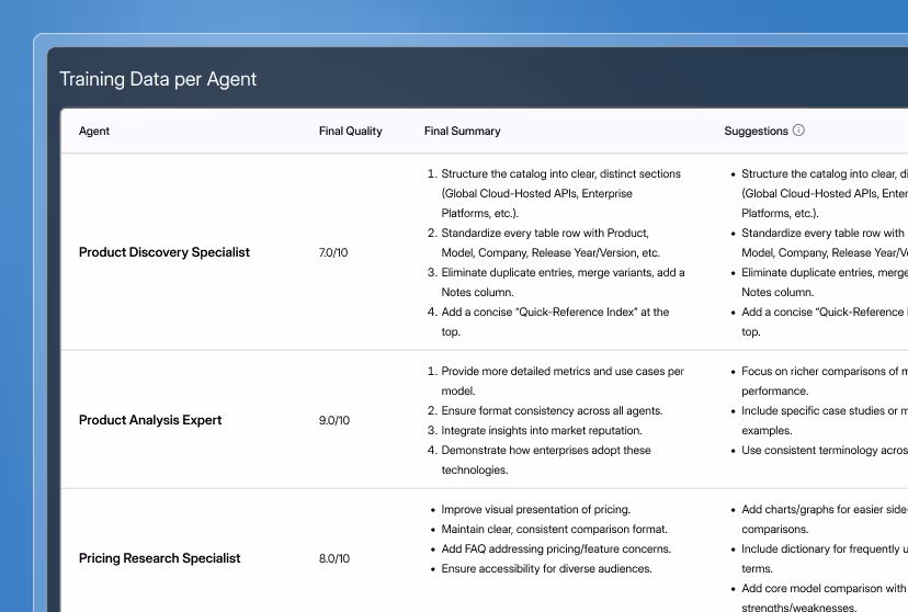 Improve AI agents by performing automated, iterative training which discovers and applies relevant suggestions.