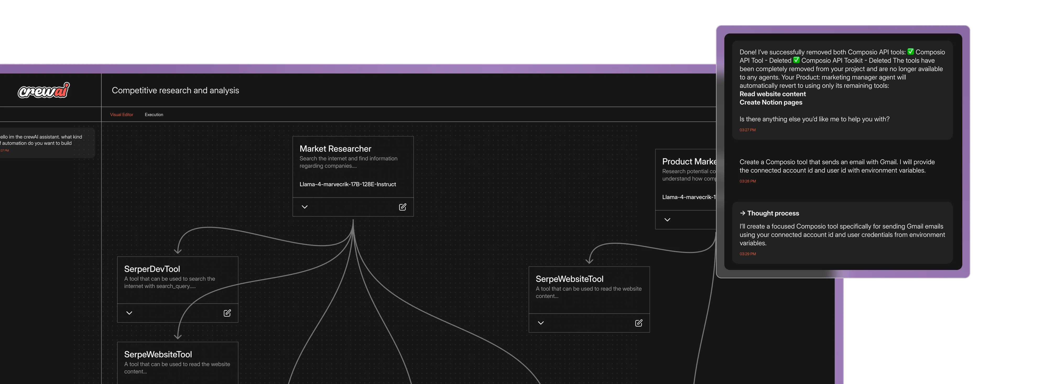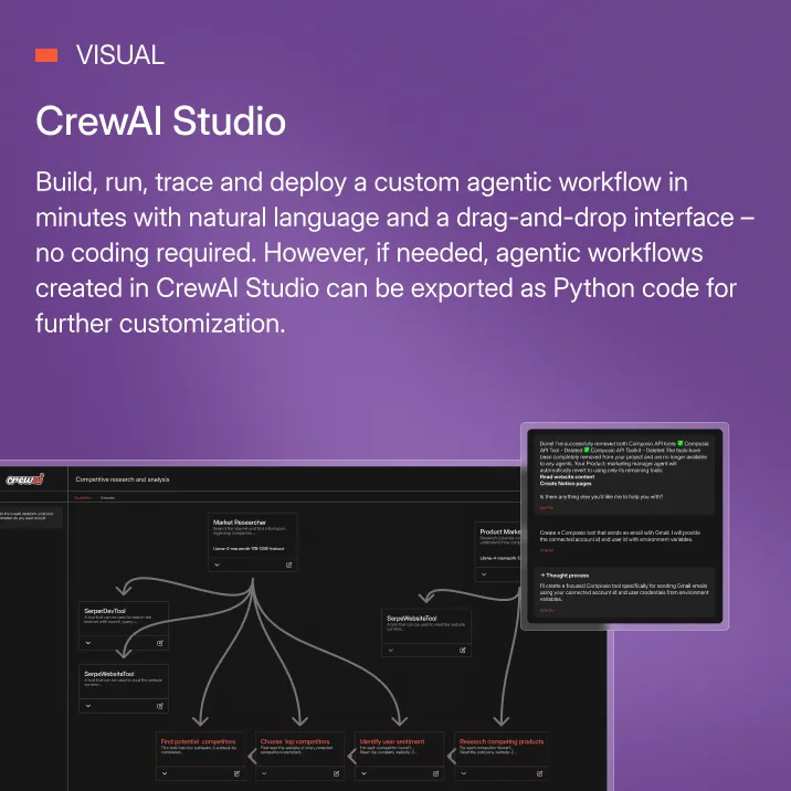 A crew of specialized AI agents can be built in minutes with CrewAI Studio, a visual editor with a drag- and-drop interface and an AI copilot for assitance. However, developers and engineers can take advantage of both object and event-based APIs to apply advanced options.