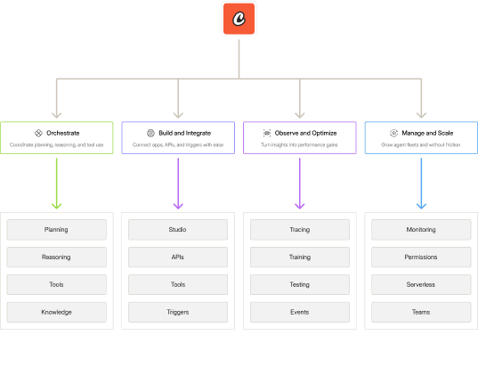 Manage the full AI agent lifecycle — build, test, deploy, and scale — with a visual editor and ready-to-use tools.
