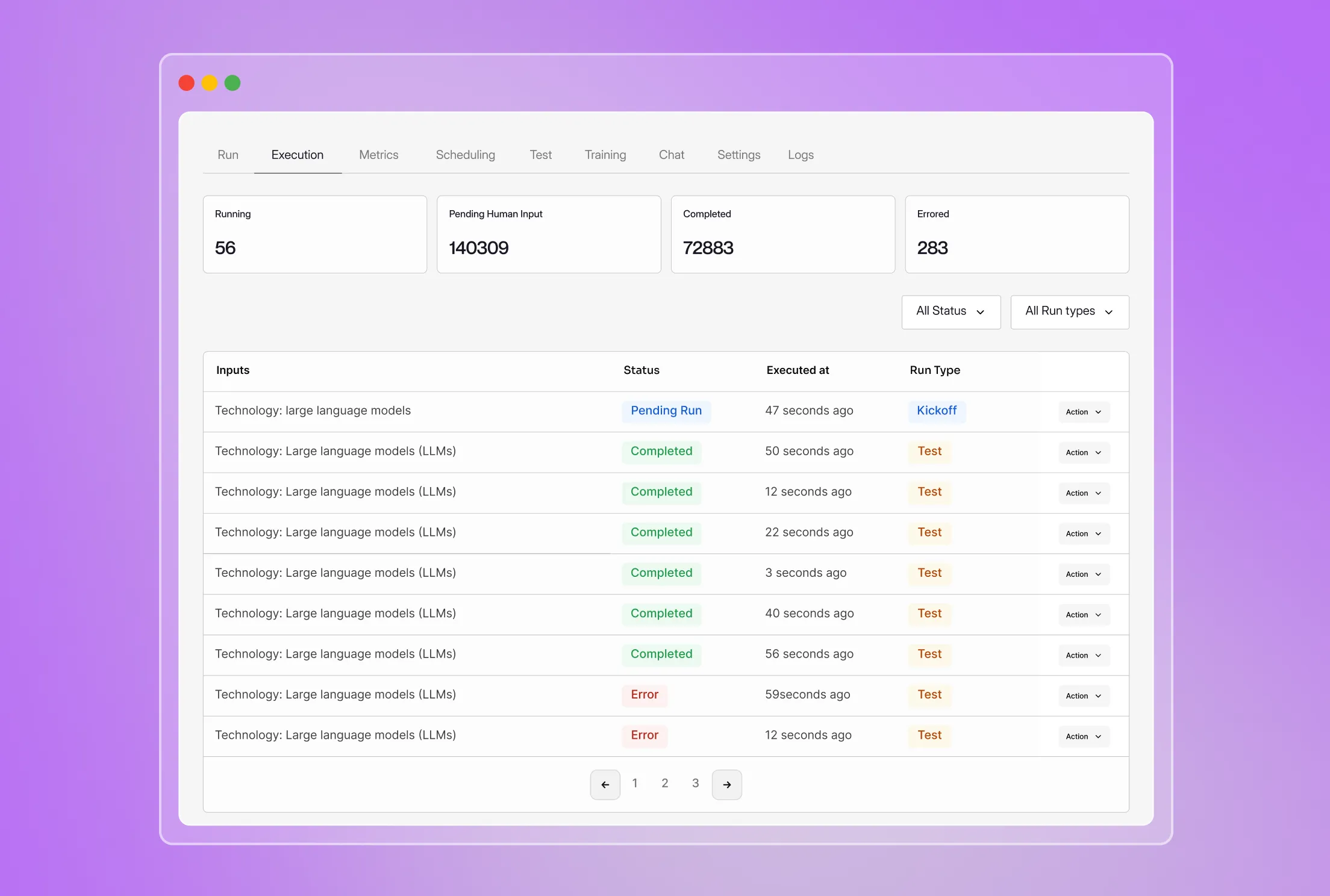 Track current and previous agentic workflow executions based on status, time and type.